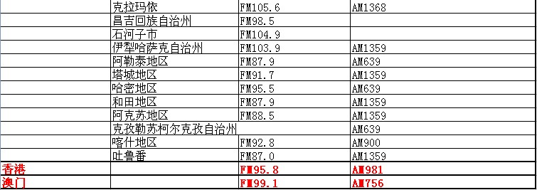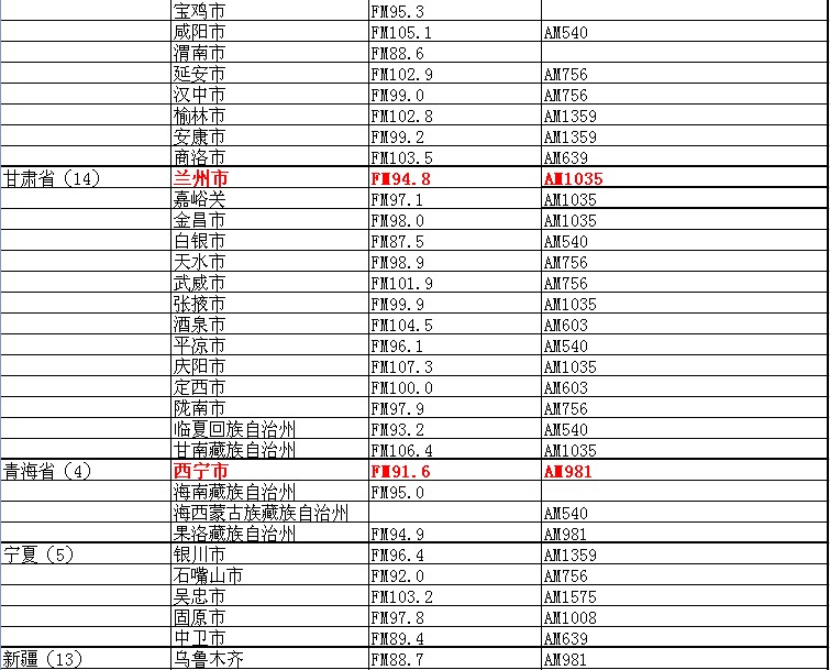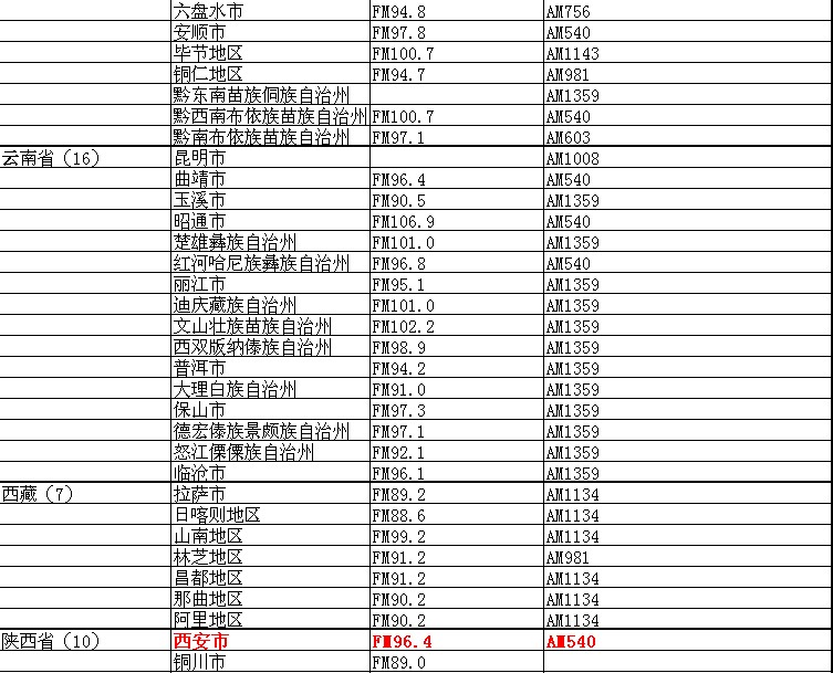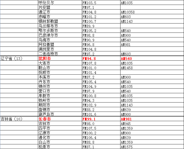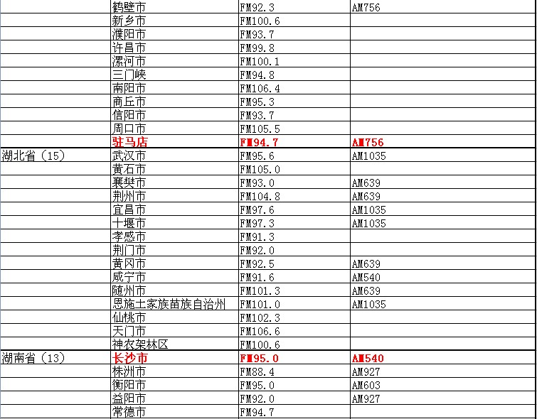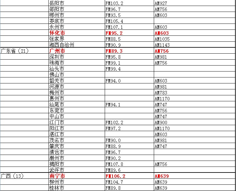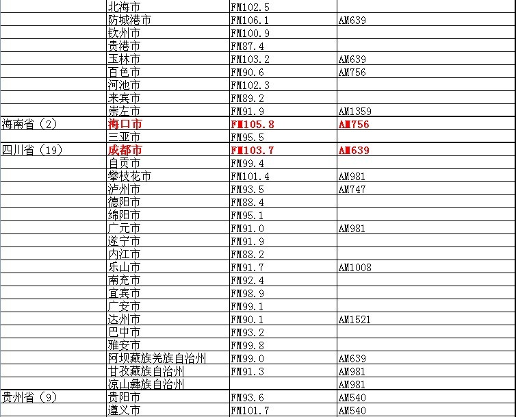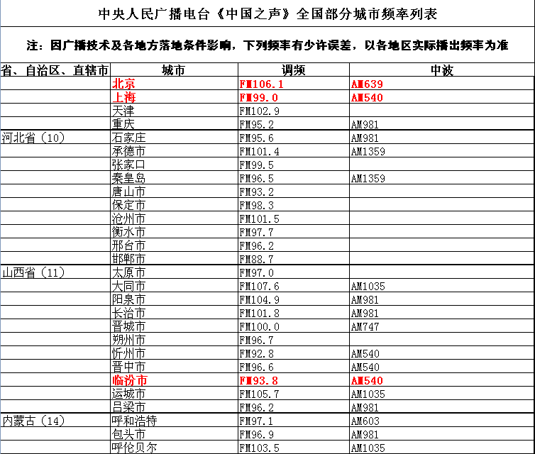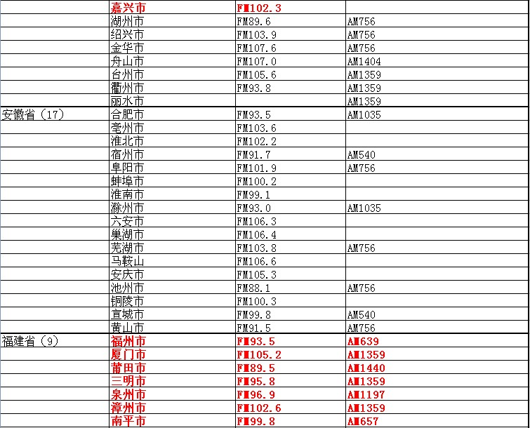 新年在即,为适应销售旺季的需要,法国之光将再次在中央人民广播电台“中国之声”频道投放7.5秒广告,从2月11日(大年初二)起,具体时间点为10:02、10:52、14:02、14:32、15:02、16:02、16:27,一天7次,敬请关注。 具体城市频率请参考以下: 全国部分频率分布表