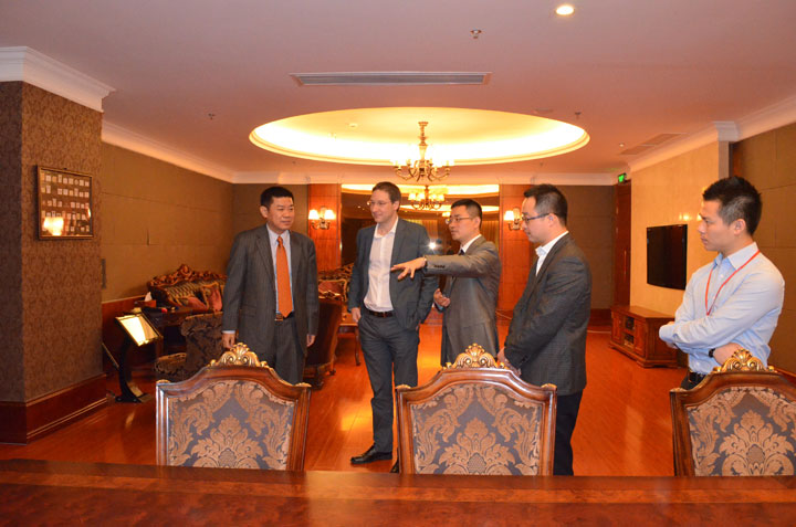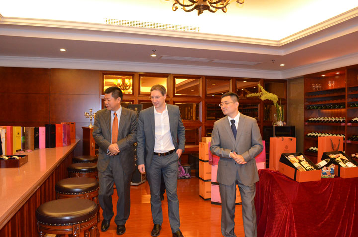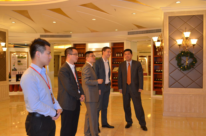 2013年12月13日上午,法国驻广州总领事馆商务处主任 Bertrand QUEVREMONT 和商务专员Felix先生一行莅临法国之光运营总部,在公司领导的陪同下Bertrand一行参观了公司的展厅、专卖店、会所及酒窖,对法国之光的专注及专业表示较度的赞赏和肯定。他们还就法国葡萄酒在中国的发展及与法国酒庄的进一步合作与公司高层进行了深度探讨。