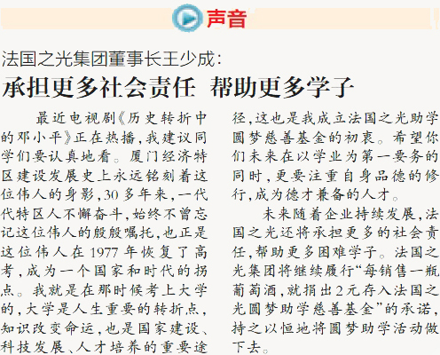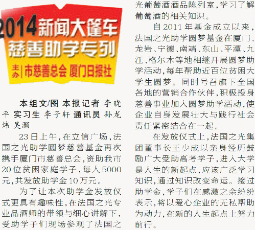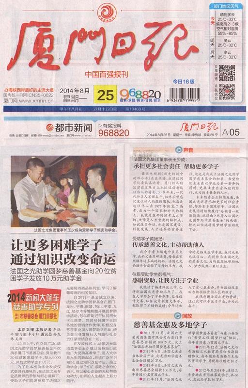8月25日,厦门日报对本次法国之光助学圆梦慈善基金发放会进行了报道。