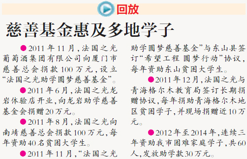 法国之光集团也将继续履行“每销售一瓶葡萄酒,就捐出两元存入法国之光圆梦助学慈善基金”的承诺,持之以恒地将圆梦助学活动做下去。