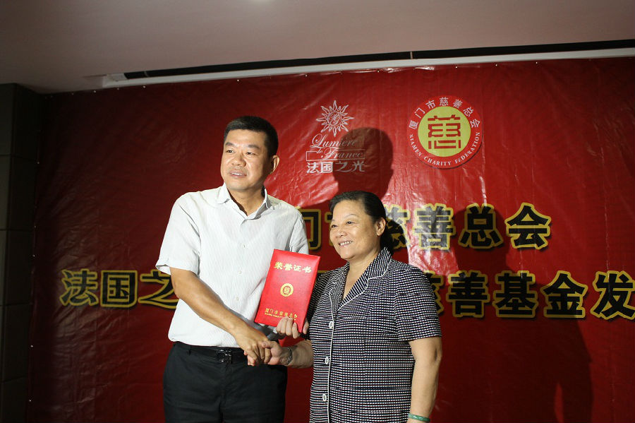 厦门市慈善总会为法国之光集团董事长王少成先生颁发证书