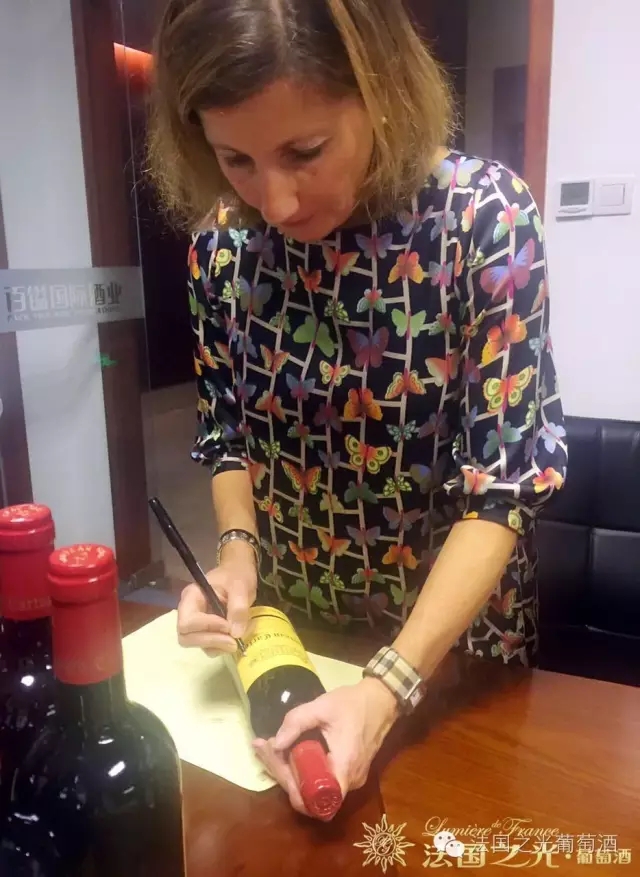 Catherine 女士在法国之光.卡特庄园干红上签字赠送给到场营销合作伙伴