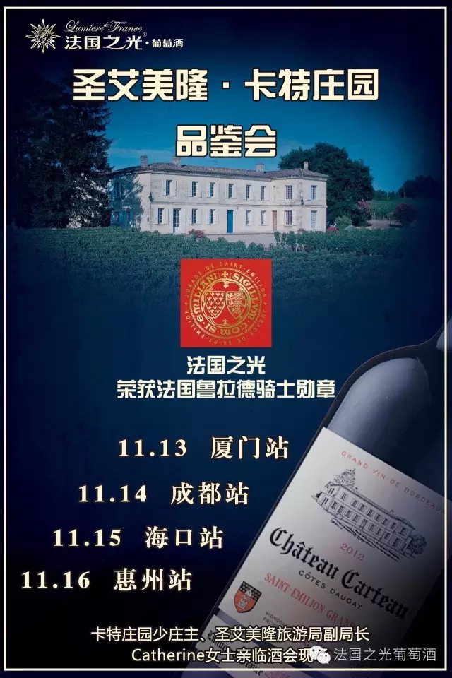 对于 Catherine 女士的到来,法国之光大家庭成员都给予了*热烈的掌声欢迎,为了全国各地的营销合作伙伴都能领略法国之光卡特庄园少庄主Catherine 女士的风采,特意安排 Catherine 女士 13号在厦门总部、14号在成都运营中心、15号在海口运营中心、16号在惠州运营中心连续四天举办 《法国之光圣艾美隆.卡特庄园全国巡回品鉴会》。