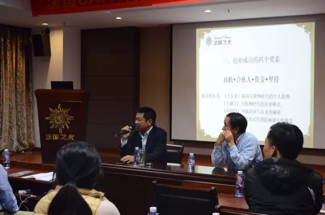 随后在法国之光的多功能厅,由法国之光葡萄酒董事长就自己多年来的创业经验与深切体会,对厦大 创业班的同学们就“创业=创新=创造价值”进行了精彩的课程分享,有档次的的思想交流与观点碰撞让大家受益匪浅。