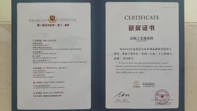 经过ABAS专家委员会的严格的综合考评,并在来自亚洲各国的领导、品牌领袖、专家学者、金融界专业人士、媒体记者的共同见证下,法国之光葡萄酒喜获“中国(行业)十大影响力品牌”的殊荣。