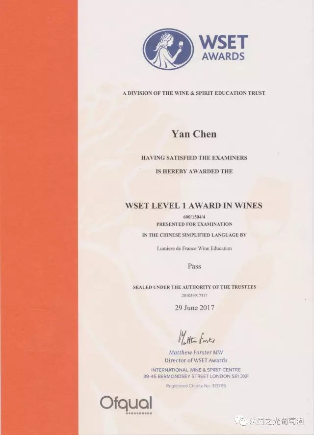 参加培训并通过考核的学员可获得英国WSET葡萄酒及烈酒教育基金会颁发国际认证的——“WSET品酒师证书”,本证书拥有唯一编号,全球葡萄酒行业内通用。