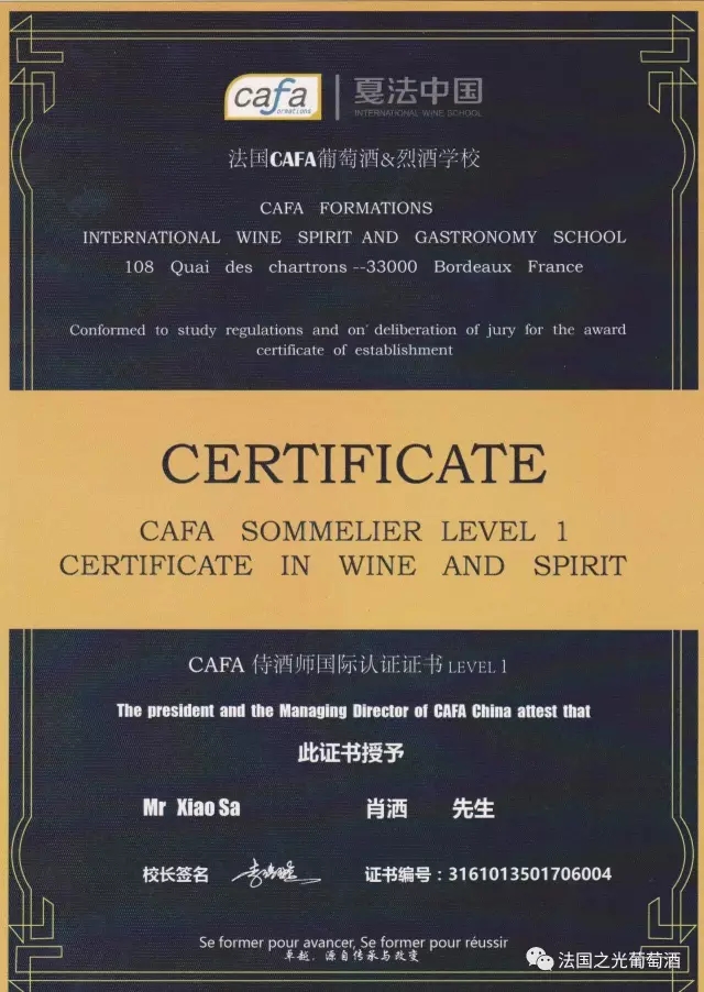 另外,此次培训班,法国之光葡萄酒学院还加入了法国CAFA侍酒师的培训教学,这是法国之光葡萄酒学院原创的“双师双证”相结合的培训方式,一次培训,就能考两个证书,一举两得。