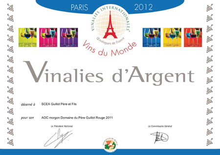 2012年3月,第18届Vinalies国际品酒大赛在法国巴黎隆重举行。DOMAINE DU PERE GUILLOT酒庄生产的法国之光摩根干红葡萄酒,以其靓丽的宝石红色、轻盈的酒体,优雅馥郁的果香及饱满复杂平衡的口感,赢得了大赛评委组的一致好评,斩获银奖。