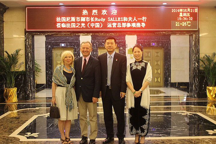 2014年5月21日,法国尼斯市副市长鲁迪•萨尔(Rudy SALLES)及其夫人安妮•萨尔(Annie SAllES)一行莅临法国之光(中国)运营总部。在公司领导的陪同下Rudy SALLES一行参观了公司的展厅、专卖店、品酒区及酒窖,对法国之光葡萄酒的专注及专业表示高度的赞赏和肯定。