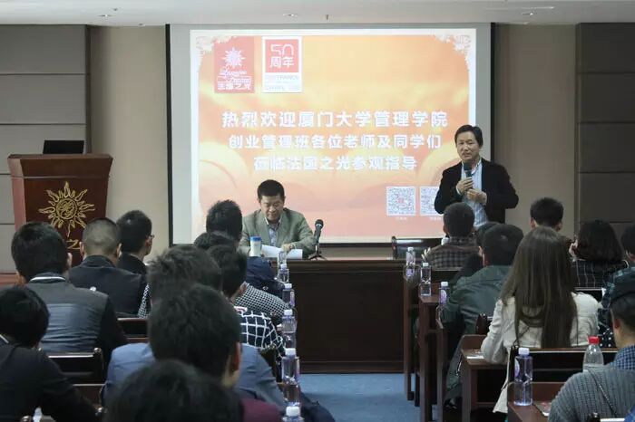 2015年3月29日,厦门大学管理学院《创业管理班》来到法国之光(中国)运营总部参观学习并听取王董的创业指导课程。70余名厦门大学管理学院的学子此次走出校园,以深入企业、学习创业为初衷。