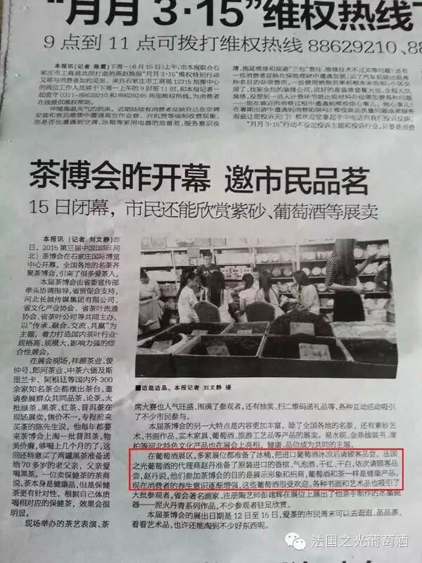 2015年6月12日至6月15日,2015第三届中国国际(河北)茶博会在石家庄国际博览中心隆重举行,全国各地的名茶名酒齐聚茶博会,引来了众多的爱茶人和葡萄酒爱好者。作为中国消费者喜爱的进口葡萄酒代表品牌,法国之光亮相本届茶博会,成为此次展会上的一道十分亮丽的风景线。