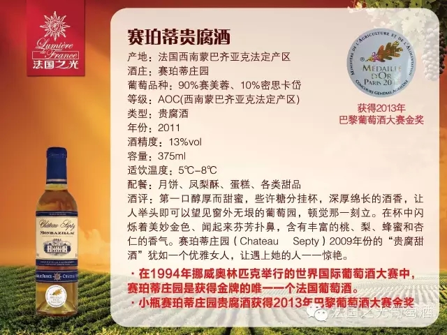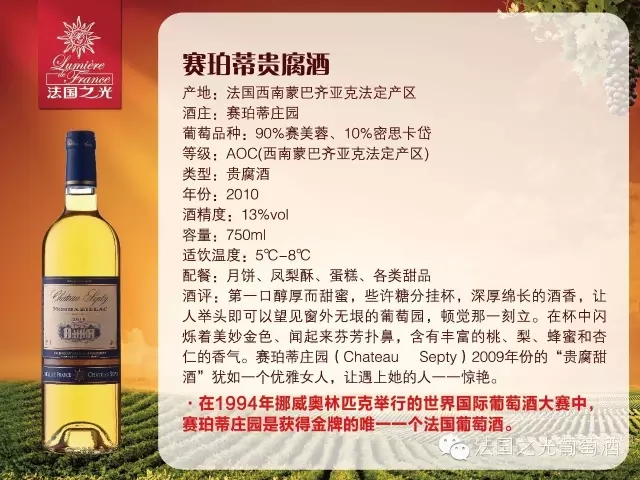 法国之光·赛珀蒂庄园贵腐酒是一种很珍贵的甜葡萄酒,刚入口喝起来醇厚而甜蜜,酒液在杯中闪烁着美妙金色、闻起来芬芳扑鼻,含有丰富的桃、李、蜂蜜和杏仁的香气。先吃一口月饼然后喝一口法国之光·赛珀蒂庄园贵腐酒,两者在口中完美的结合,可以完全的满足你的味蕾.