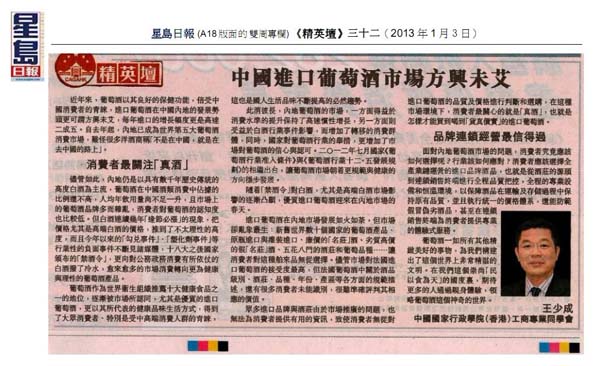 2013《星岛日报》刊登王董葡萄酒市场分析文章